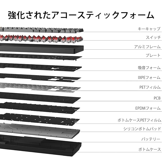 【大幅に強化されたアコースティック・フォーム】 K8 Maxは、快適性を高める先進のIXPEアコースティック・フォームと、優れたキースイッチ・サポート、応答性、耐久性を実現する弾力性のあるEDPMフォームを採用。スチールプレートは、レスポンスの良いフィードバックと穏やかなタイピングサウンドを提供し、重量を加えることで安定性を高めます。