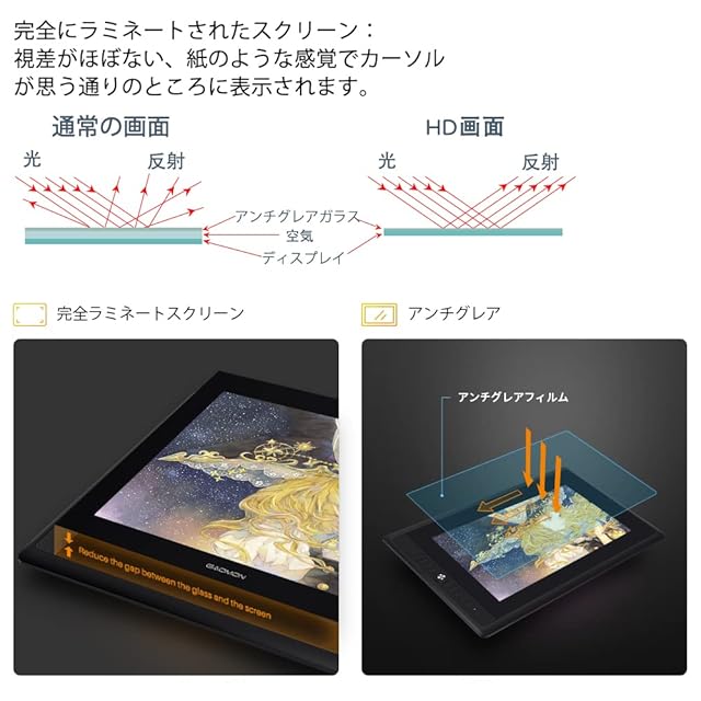 [フルラミネーションディスプレイ& 88% NTSCの広色域]-- フルラミネーション加工のおかげで、エアギャップがないため、視差を最小限にまで減らすことができます。色域:88% NTSC;画面解像度:1920*1080;表示エリア: 344.16 × 193.59mm 。