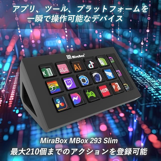 【片手で作業効率アップ!左手デバイス】 「MiraBox MBox HSV293 Slim」は、作業の効率を向上させるのに役立つキーボードです。本体に15個のカスタム可能なLCDショートカットキーを搭載し、アプリ、インターネットサイト、マイクのオンオフ等を使用用途に合わせて自由に設定でき、ワンタッチで操作できます。