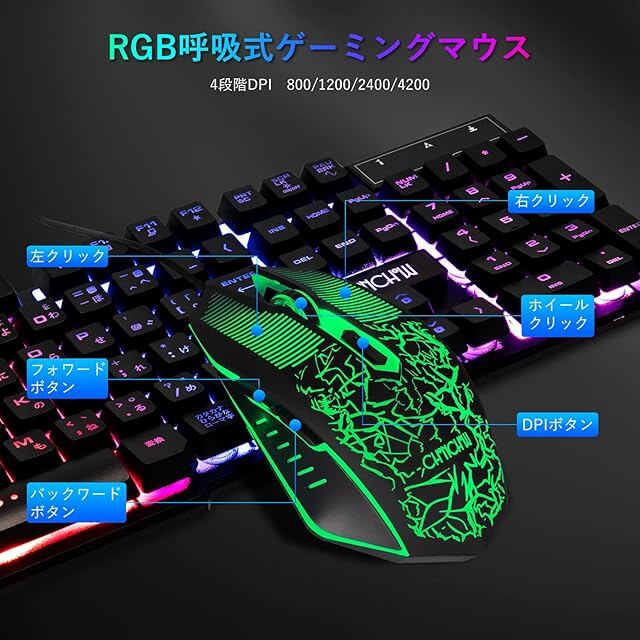 商品名:CHONCHOW ゲーミングキーボードマウスセット ps4 スイッチに対応 108キー 日本語配列 「無変換」/「変換」キー付き LEDバックライト 19キー防衝突 USB 有線キーボード 防水 七色LEDゲーミングマウス 4段階DPI PC/Windows/Mac対応 (1910J5)
