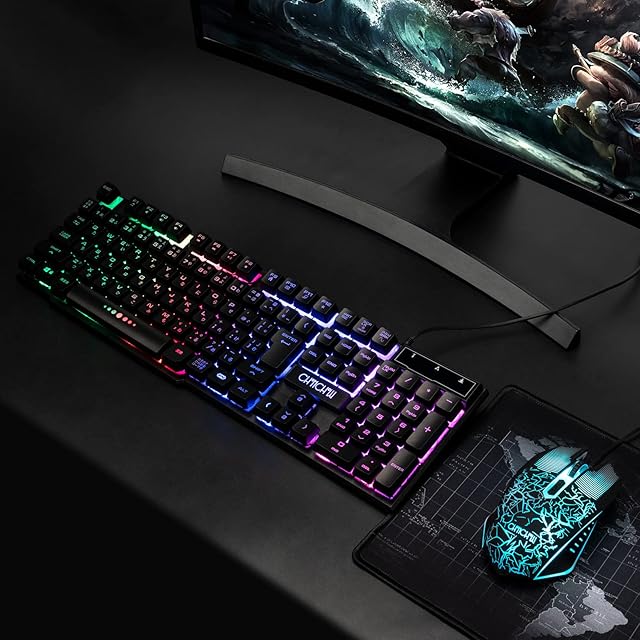 CHONCHOW ゲーミングキーボードマウスセット ps4 スイッチに対応 108キー 日本語配列 「無変換」/「変換」キー付き LEDバックライト 19キー防衝突 USB 有線キーボード 防水 七色LEDゲーミングマウス 4段階DPI PC/Windows/Mac対応 (1910J5)