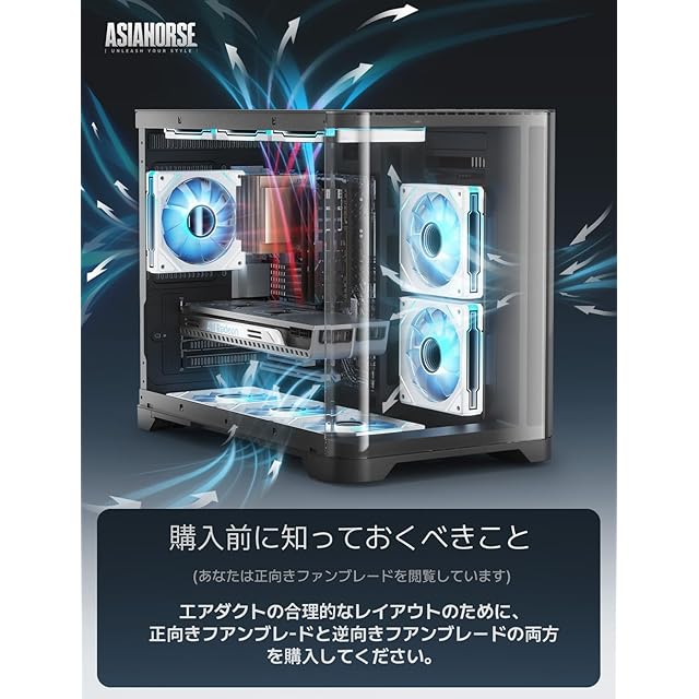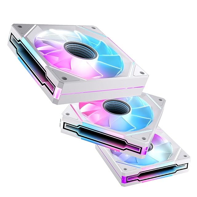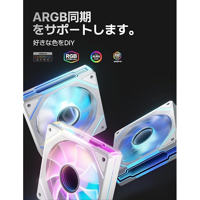[仕様]: モデル:AMICI-5GT-White。数量:3本。サイズ:120*120*2.5。逆向きファンブレード。回転数:650-1800 RPM/Min。ノイズ:6-30 dB(A)。風量:61.5 CFM 。風圧:2.0mmH2O。ベアリングのタイプ:ハイドロダイナミックベアリング。寿命:50000時間以上。240/360mmのCPU水冷高さに対応。
