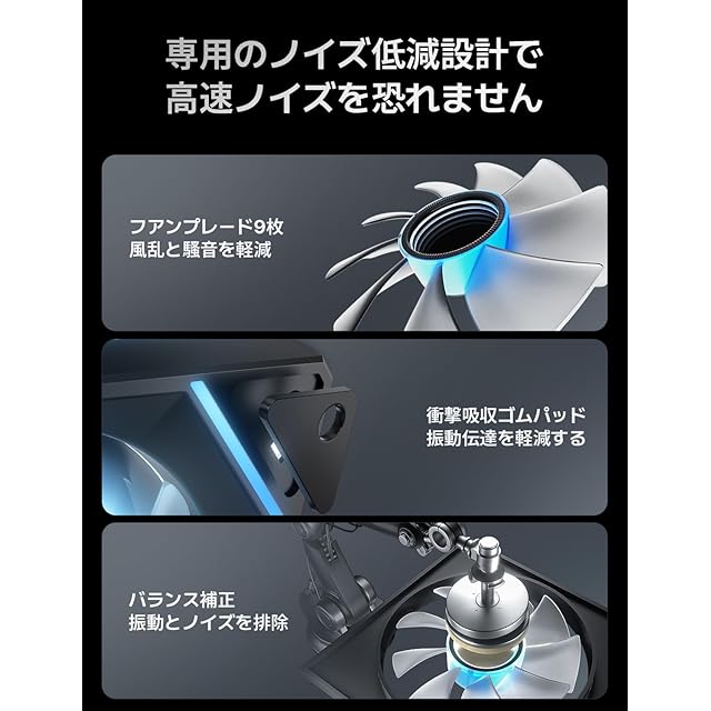 [仕様]: モデル:AMICI-5GT-Black。数量:3本。サイズ:120*120*2.5。逆向きファンブレード(吸気)。回転数:650-1800 RPM/Min。ノイズ:6-30 dB(A)。風量:61.5 CFM 。風圧:2.0mmH2O。ベアリングのタイプ:ハイドロダイナミックベアリング。寿命:50000時間以上。240/360mmのCPU水冷高さに対応。