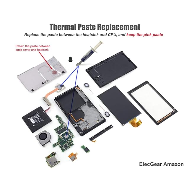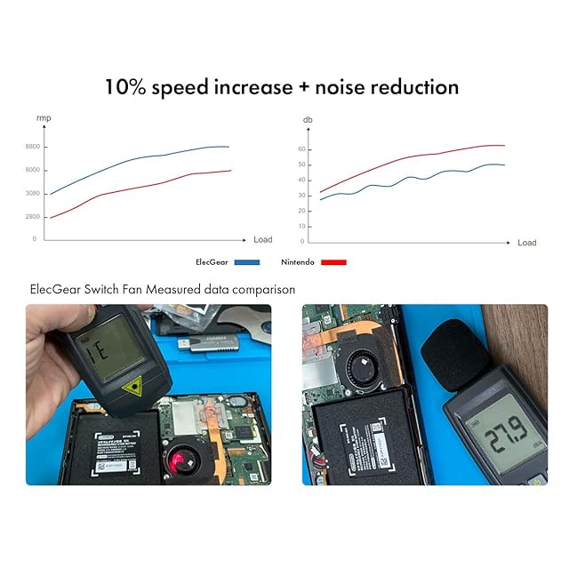 [ElecGear がアップグレードしたもの] – 新設計の冷却ファンは最大8800RPM(100%デューティ)で、任天堂のオリジナルより10%高速です。 ファンの各部分は細かい動的バランスでテストされているため、ローターに赤いバランスのとれた泥が見える場合があります。 洗練された3倍の耐衝撃性Oリング脚。 追加の吸音EVAシートが金属プレート全体を覆い、ノイズレベルを2dB減少させます。 DIYの楽しみのために意図的に貼り付け操作を任せます