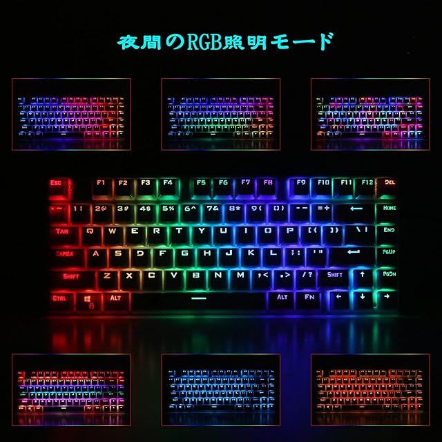 【RGB変色超かっこいいLEDバックライト】▶ゲームの世界に楽しの同時に綺麗なライトが輝いている。暗い場所でも精確にキーの位置を確認でき、戦いにコミットし勝利に導きます。このe元素 81キーメカニカルゲーミングキーボードのキーライトには、FN + PGDNで、10種異なるのバックライトモードと呼吸モードが転換可能です。FN + "+" / "—"を押して、単色を調整することができます。FN + "↑" / "↓"キーを押して、バックライトの明るさを調整可能です。照明が必要ない場合は、ライトをオフにすることもできます。ダブルショット射出成形キーキャップは、グレアのないエレガントでクリアな均一なバックライトを提供します。