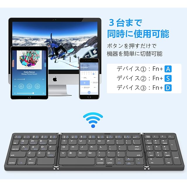 ワイヤレスキーボード 折りたたみ式 iPad Bluetooth テンキー搭載 薄型 3台デバイス対応 コンパクト無線 静音 小型 スマホ タブレット パソコン用ミニキーボード iOS/Windows/Mac/Android 対応 持ち運びやすい 日本語説明書付き(黒)