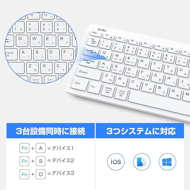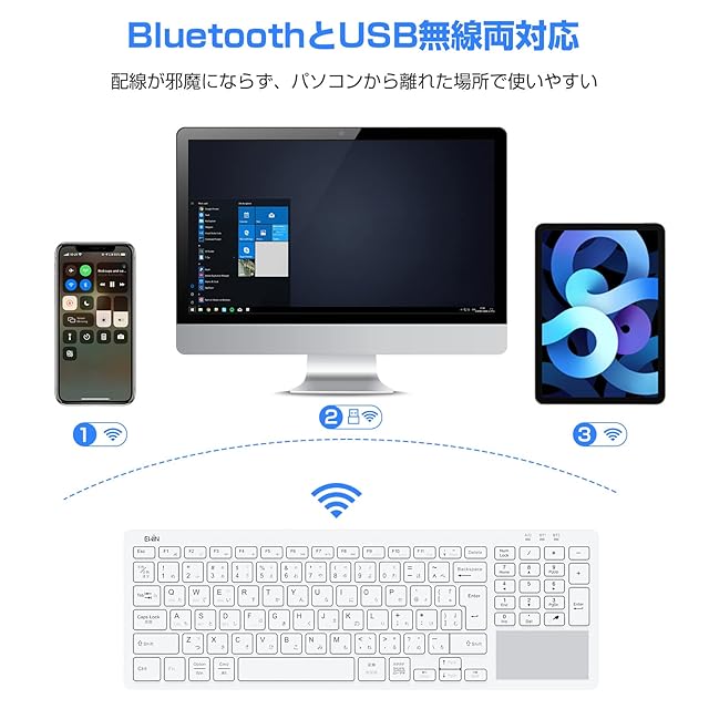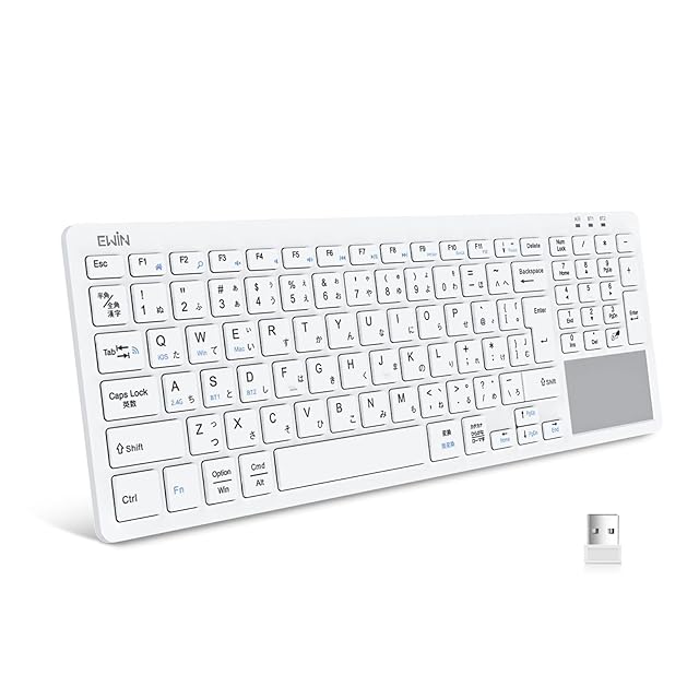 Ewin Bluetooth/USB 無線両対応キーボード 2.4Ghz接続 タッチパッド付き 日本語配列 ワイヤレスキーボード 3つシステム対応 3台デバイス切り替え レシーバー付き 電池式 iPad パソコン タブレット スマホ用 Windows Mac iOS対応 テレワーク ホワイト