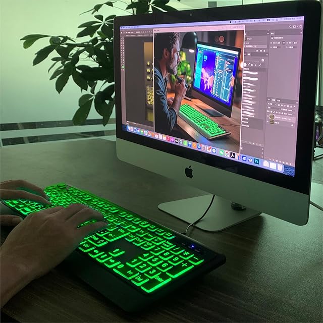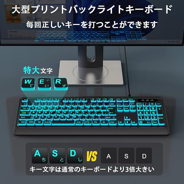 DHKBL 大きめの文字のバックライト付きキーボード - 7つの交換可能なバックライトカラー、静かなUSB有線コンピューターキーボード、折りたたみ式スタンド、有線フルサイズキーボード Windows、PC、ノートパソコン用