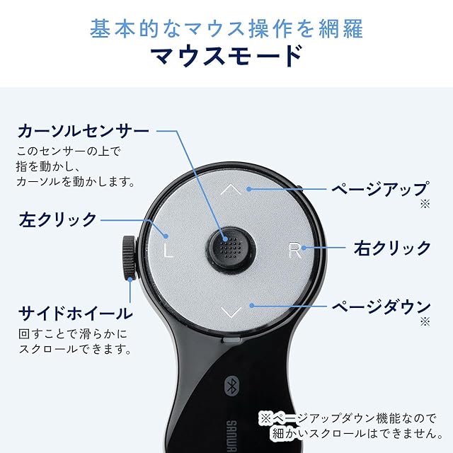 中央の スティック を傾けることでカーソルがスムーズに動きます。新しく ホイール が追加となり、スムーズな スクロール が可能になりました。