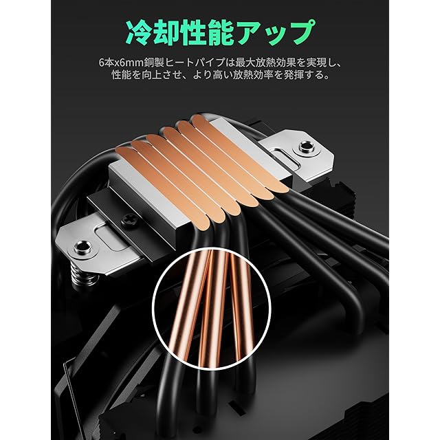【6XΦ6mm 纯銅ヒートパイプ】upHere UE2シリーズCPUクーラーは、ユニークなヒートパイプ配置とデュアルタワー設計により、より高い放熱効率を発揮します。CPUファンは6本x6mm径直接接触型銅製ヒートパイプを特徴とし、放熱範囲を最大限に広げた。ヒートパイプとCPUの接触面を30mm確保し、最適な放熱を実現します