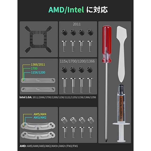 【Intel/AMD両対応】UE2シリーズCPUクーラー Intel/AMDサポート、Intel LGA: 2011/2066(X79/X99マザーボード)1851.1700.1200.1150.1121.1155.1156.1366/1356。AMD:AM5.AM4.AM3.AM2.AM3+.AM2+.FM2.FM1。異なるCPUコンセントプラットフォームに対して、相応の取付板或いは締結部品を提供する