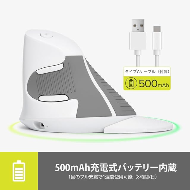 【USB-C充電式】このマウスは付属のUSBケーブルで簡単に充電できます。500mAhのバッテリーを内蔵し、フル充電で最大1ヶ月間マウスを使用できる省エネモードを搭載。マウスを充電しながら作業ができ、生産性が向上します。