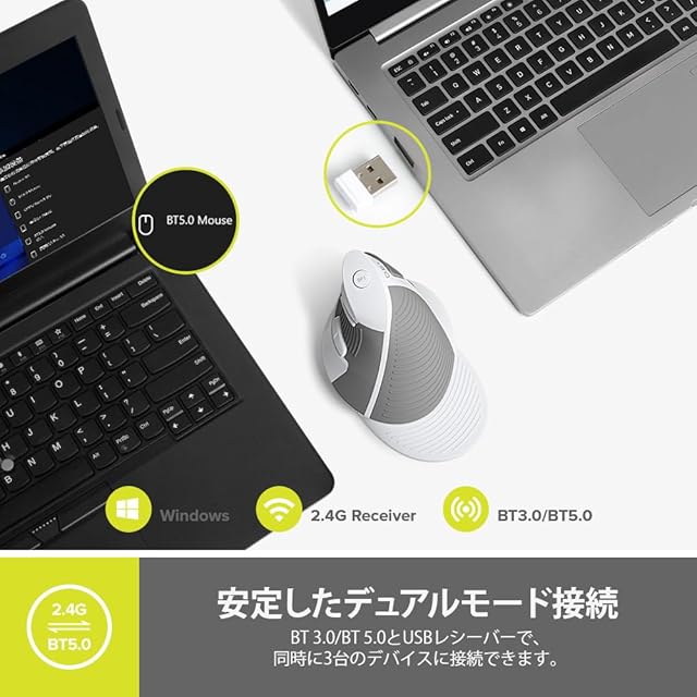【デュアルモード接続】マウス底面に収納されたUSBナノレシーバーで、Bluetooth 3.0/5.0または2.4Gワイヤレスで接続できます。最大3台のデバイスに対応し、ワンクリックで簡単に切り替えられるので、すべてのワークステーションで生産性を維持できます。(注:BT 5.0はWin8+システム専用です)