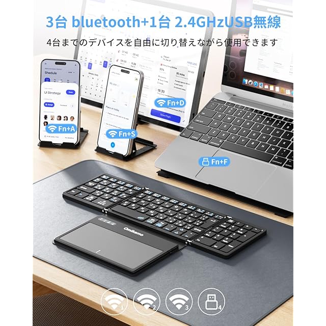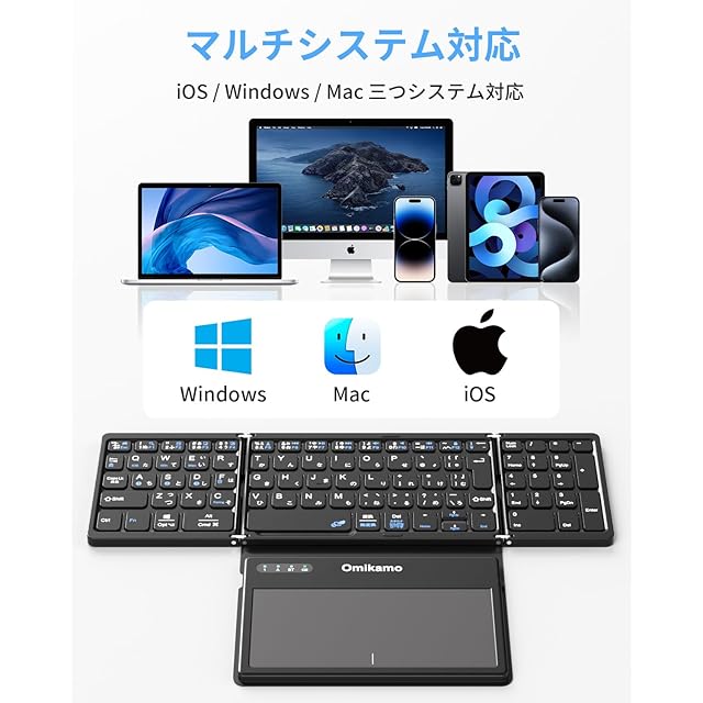 【最新型】Omikamo キーボード bluetoothと2.4GHzUSB無線 折り畳み式 JIS標準日本語配列 大型タッチパッドとテンキー搭載 4台デバイス切替 左右Shiftキー/L型Enterキー搭載 ワイヤレス iPad mini スマホ iOS/Windows/Mac対応 軽量 薄型 パンタグラフ 充電式 (黒)