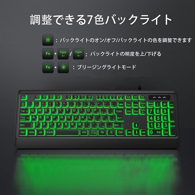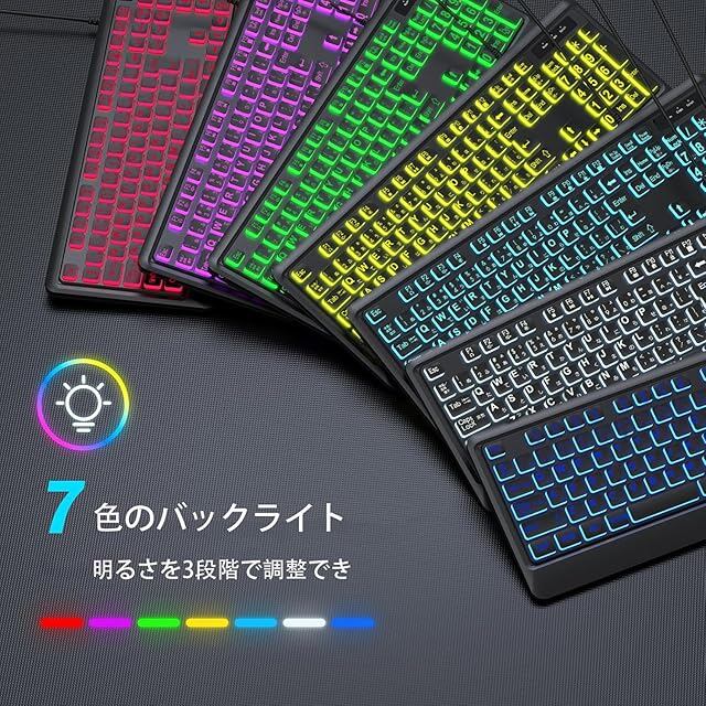 調整できる7色バックライト:カラフルなバックライト付きデザインの有線キーボードです。3段階の明るさレベルと7色のオプションが用意されているので、自分が使いやすいように明るさとライトの種類を選べます。ブルー、グリーン、レッド、シアン、パープル、イエロー、ホワイトから選択できます。自由にキーボード設定を選び、デスクのセットアップをグレードアップさせましょう
