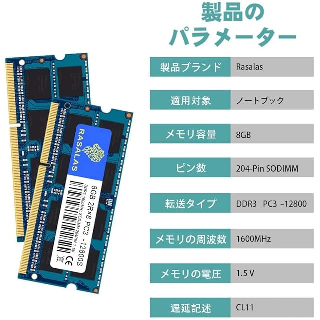 16GB DDR3 1600MHz PC3-12800 8GB×2枚 12800S ノートPC用メモリ SODIMM RAM CL11 204Pin Non-ECC 電圧1.5V 両対応