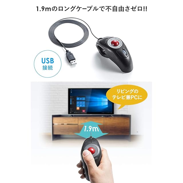 1.9mのロングケーブル仕様なので姿勢を変えての操作や、会議のプレゼンや動画視聴などの際に離れた場所から操作するのにも便利です。左右どちらでも操作しやすいようなボタン配置の トラックボールマウス です。片手が疲れたときに持ち替えて使用することもできます。