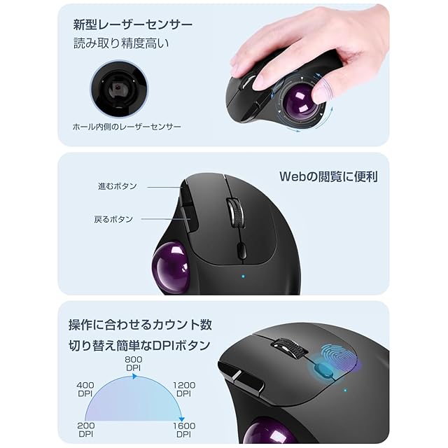 Ewin トラックボールマウス Bluetooth&2.4GHz両対応 3台同時接続 トラックボール 【NEWモデル】 ワイヤレス 親指 静音タイプ 高精度 エルゴノミクス 瞬時接続 無線マウス 7ボタン 進む/戻るボタン Windows/Mac/iOS/Android多機種対応 (パープル)