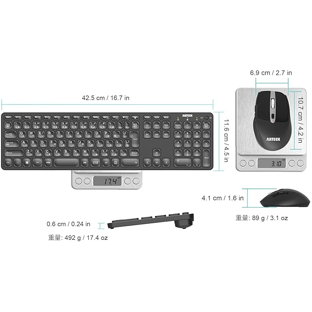 【製品内容】Arteck HW305-3無線キーボード、MW167マウス、共用の一つUSBレシーバー「マウスの裏面に収納」、USB Type-C充電ケーブル、ユーザーマニュアル、そして弊社人気の2年間のと親身なカスターマーサービスが付きます。