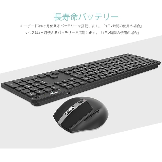 【長寿命バッテリー】業界大容量の充電式リチウムイオン電池搭載、1回フル充電で6ヶ月間が使えるキーボートと4ヶ月使えるマウス。「1日2時間の連続使用の場合」