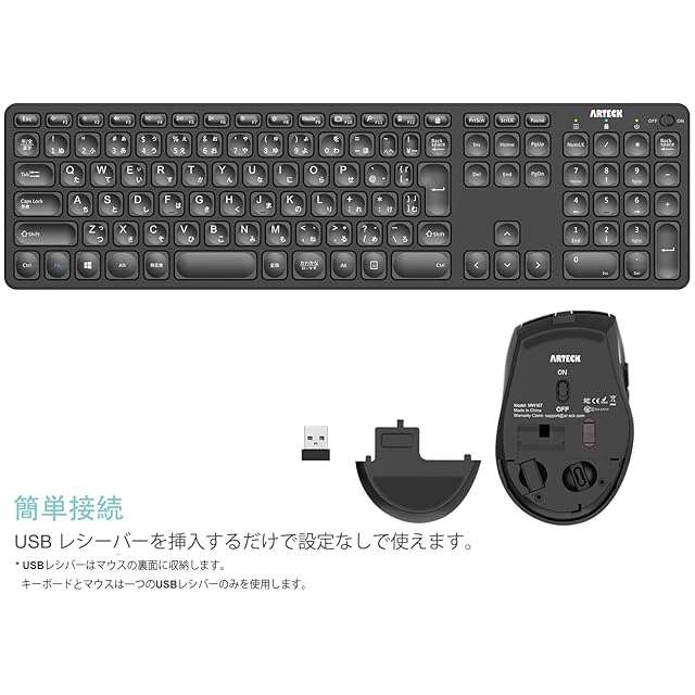 【簡単接続】PCなどのUSBポートにUSBレシーバー「マウスの裏面に収納」を差し込むだけでキーボードとマウスを使えます。