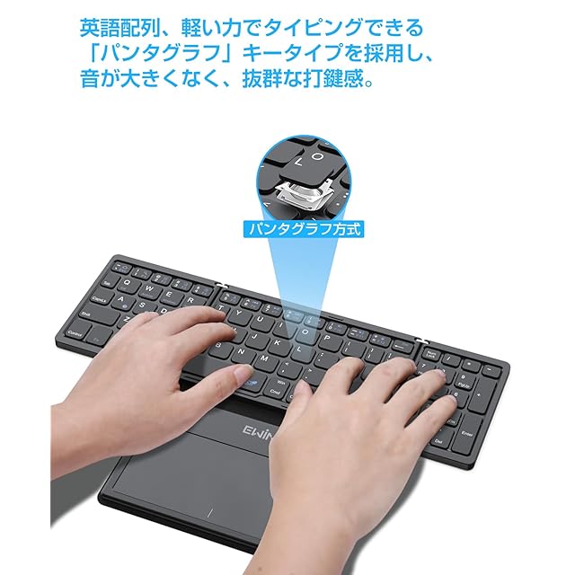 商品名:キーボード ワイヤレス 折り畳み bluetoothとusb無線両対応 EWiN 大きいトラックパッドとテンキー付き フルサイズ ブルートゥース keyboard 4台までのデバイスと接続可能 ios mac win android対応 英語配列 アイパッド ipad iphone パソコン タブレット スマホ スタンド付き パンタグラフ レザーカバー付き Type-C充電式 ブラック