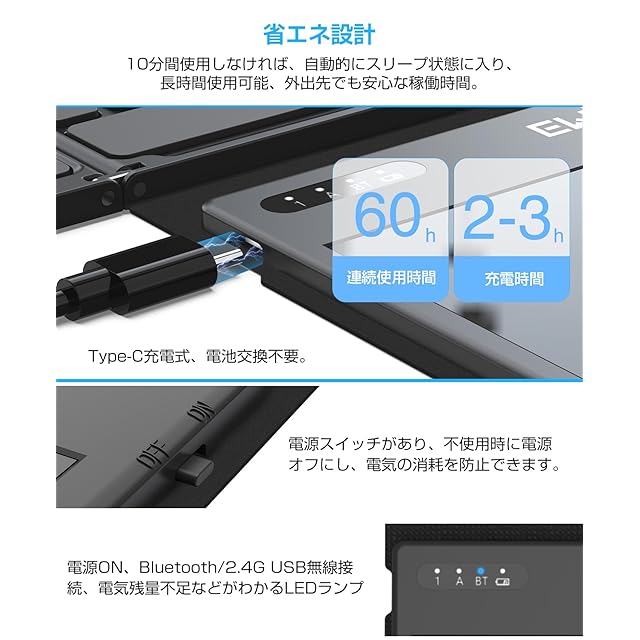 ✔【Typc-C充電式、オートスリープ機能付き、電源スイッチ搭載、省エネデザイン&LEDランプ付きbluetoothキーボード】 本ipad mini キーボードは繰り返し充電可能なリチウムイオン電池を搭載しており、付属の充電用Type-Cケーブルで充電可能、2-3時間のフル充電で、連続的に60時間使用できます。アイパッド キーボードはオートスリープ機能付き、10分間使用しない場合、省エネのために接続を自動的にオフにします。タッチパッド付きキーボードは電源スイッチがあり、不使用時の電気の消耗を防止できます。折りたたみキーボードはNumLock状態/bluetoothペアリング/電源オン/電気残量不足などがわかるLEDランプもついています。パッケージ内容:Bluetooth3.0/5.2+2.4G USB無線両対応タッチパッド搭載折り畳みキーボード*1、スマホタブレットスタンド*1、USBレシーバー*1、Type-C充電ケーブル*1、オンライン電子版または紙日本語取扱説明書*1。