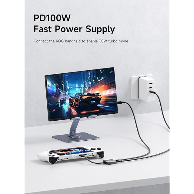 100W急速充電: Hagibis ARグラスアダプターは、ARグラスと併用すると、デバイスに最大100Wの充電を提供します。ROGハンドヘルドに接続すると、30Wの拡張モードをオンにできます。注: 充電能力はソースデバイスによって異なります。