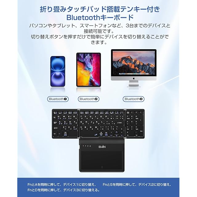 商品名:キーボード ワイヤレス 折りたたみ bluetooth 日本語配列 EWiN 大きいトラックパッドとテンキー付き フルサイズ ブルートゥース keyboard 3台までのデバイスと接続可能 ios mac win対応 アイパッド ipad iphone パソコン タブレット スマホ スタンド付き パンタグラフ レザーカバー付き Type-C充電式 ブラック