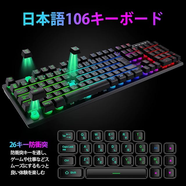 NPET キーボード マウス セット ゲーミング LED バックライト 7色 usb 26キー防衝突角度調節可能 ゲーミングキーボード 日本語配列 4階段DPI 1000/1,600/3,200/6,400 ゲーミングマウス 日本語説明書 キーキャッププーラー付き S20