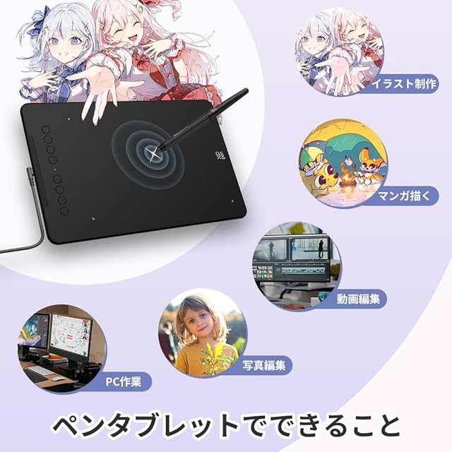 【ペンタブ仕様】作業エリア:10×6.25インチ、重さ570g、カスタマイズ可能な8つのショットカットキーを搭載。同梱のバッテリーフリースタイラスペンは、60度の傾き検知機能と8,192レベルの筆圧感度を備え、精緻なスケッチと線画のための、より高い精確性、コントロール力、流動性を提供します。