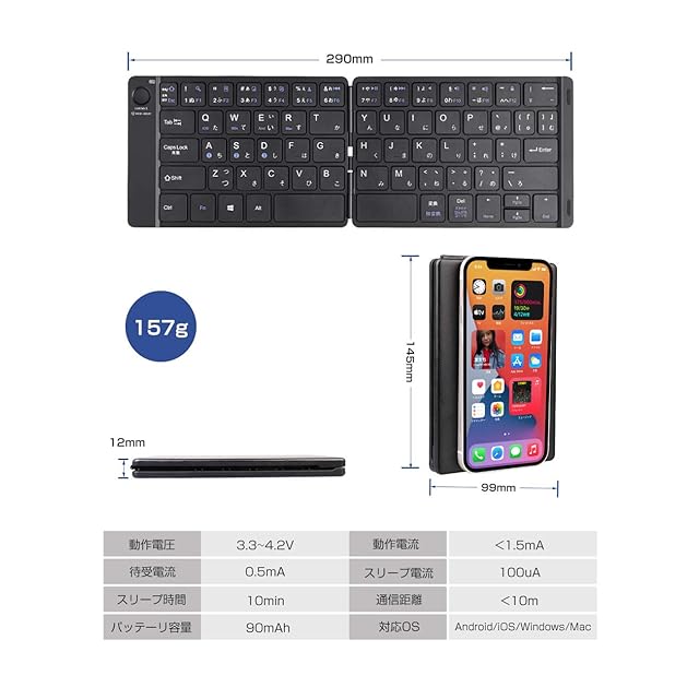 【日本初 JIS基準 折りたたみキーボード】日本ではよく採用されている日本語配列の「全角/半角」や「変換」などのキーが配置されており、日本語をスムーズに入力できるワイヤレスキーボードです。もちろん英語入力もできます。新発想の薄型手帳デザインで、スマホ並みに軽く小さく薄いキーボードを実現。かんたん操作なマグネット式で、開閉により電源が自動的にON/OFFし、特別な操作は不要です。※ご注意:いま本製品はAndroid12にアップデートした設備に対応しておりません。予めご了承の上、ご購入ください。