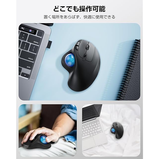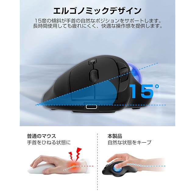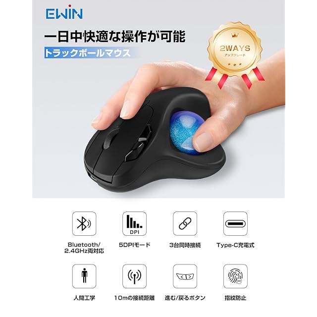 商品名:EWiN マウス トラックボール 無線 Bluetooth&2.4GHz両対応 3台同時接続 5段階DPI調節 Type-C充電式 500mAh大容量バッテリー ワイヤレス マウス 高精度 親指操作 7ボタン 進む/戻るボタン Windows/Mac/iOS/Androidなど対応