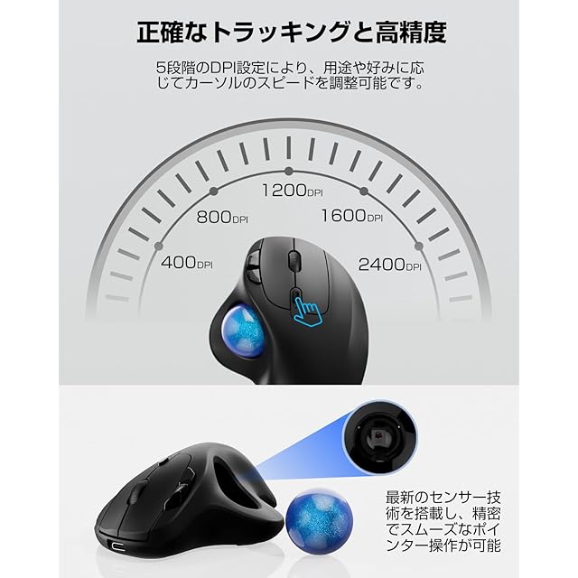 DPI:400dpi·800dpi·1200dpi·1600dpi·2400dpi 500mAh大容量バッテリー、Type-C急速充電 進む/戻るボタン Bluetooth&2.4GHz両対応 3台同時接続