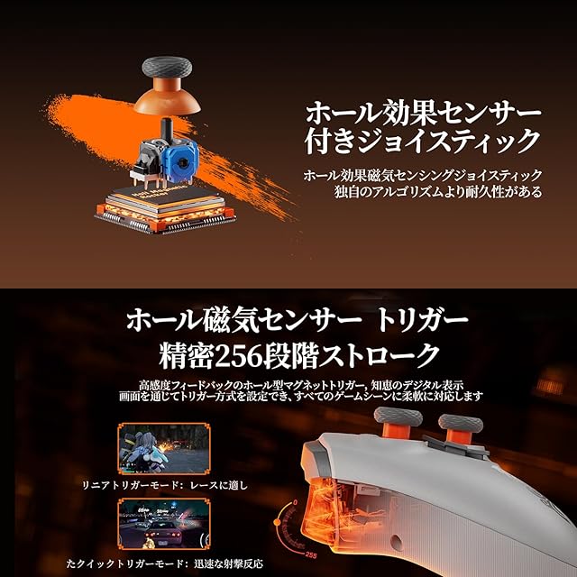 【ホールジョイスティック】新世代のホール効果ジョイスティックは、正確性を保ち、ドリフトから守ります。 ショート、ミドル、ハイの 3 ペアのサムスティック。 【アンチデッドゾーンアルゴリズム】BIGBIG WONが独自開発したHURSTアルゴリズムにより、ホールジョイスティックは従来のものより優れています。 【ホール効果トリガー】ホールトリガーコントローラーの高精度トリガーはあらゆるゲームに最適で、レーシングゲームにはリニアトリガー、FPSにはクイックトリガー(ソフトウェア)が最適です。