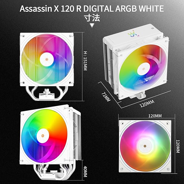 [製品仕様]モデル:Assassin X 120 R Digital ARGB White、サイズ:120x71x151mm、ヒートシンク材質:アルミニウム、ファンサイズ:120x120x25mm、ファン速度:2000rpm 10%、風圧:2.63mm h2o、風量:70.84cfm、動作音≤29.8db(a)、ファンインターフェース:4pin pwm、照明インターフェース:5V 3PIN ARGB、本体は対称的なオールアルミフィンを採用し、pwmファンと組み合わせることで、より大きな放熱面積をもたらすことができます