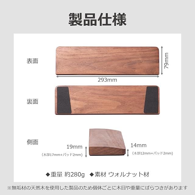 【製品仕様】◆寸法 幅293mm 縦79mm 後部高さ19mm(木部17mm+パッド2mm) 前部高さ14mm(木部12mm+パッド2mm) ◆重量 約280g ◆素材 ウォルナット材 オイルフィニッシュ ※無垢材の天然木を使用した製品のため個体ごとに木目や重量にばらつきがあります