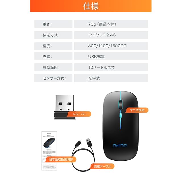 商品名:マウス 無線 【高精度・高感度&極薄型モデル】 ワイヤレスマウス 静音 薄型 7色ライト付き 800/1200/1600DPIモード 薄型マウス 2.4GHz 光学式 小型 静音マウス 軽量 節電3段階DPI切替 左右対称型 USB 簡単接続 携帯便利 Mac/Windows/PC対応 (ブラック)