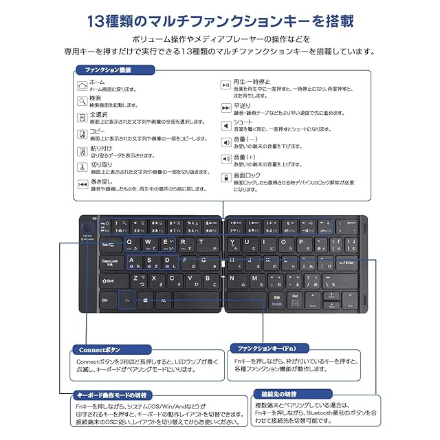 【日本初 JIS基準 折りたたみキーボード】日本ではよく採用されている日本語配列の「全角/半角」や「変換」などのキーが配置されており、日本語をスムーズに入力できるワイヤレスキーボードです。もちろん英語入力もできます。新発想の薄型手帳デザインで、スマホ並みに軽く小さく薄いキーボードを実現。かんたん操作なマグネット式で、開閉により電源が自動的にON/OFFし、特別な操作は不要です。※ご注意:いま本製品はAndroid12にアップデートした設備に対応しておりません。予めご了承の上、ご購入ください。
