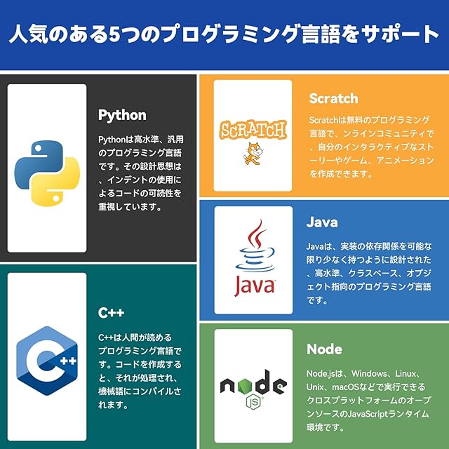 「プログラミング言語5種類をサポート:」最新のオンラインマニュアルでは、各レベルのプログラマーの需要を考慮し、学習レッスンは5種類のプログラミング言語で提供されています:C+Python 83課(Raspberry Pi 5用の38のプロジェクト含む)、Node.js 22課、Processing(Java)10課、Scratch 10課(電子工作とプログラミングスターターにお勧め)