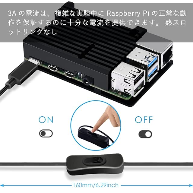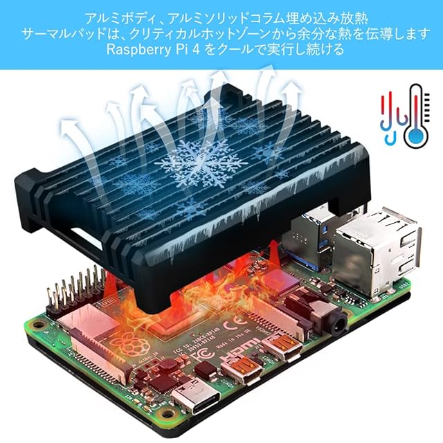 効率的な熱伝導 --- 追加のファンは必要ありません。ケース自体がヒートシンクとして機能し、受動的冷却用のサーマルパッドが付属しています。 ファンや騒音を出さずに Raspberry Pi を冷却できます