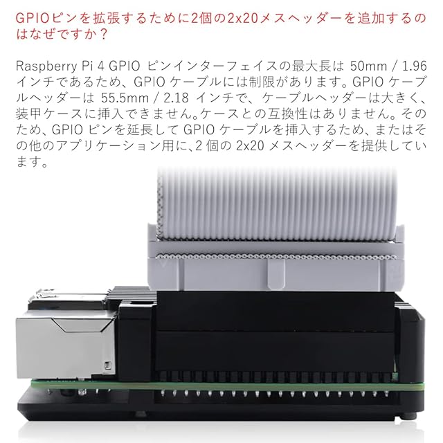 GPIOピンを延長してGPIOケーブルを挿入するため、またはその他のアプリケーション用に、2個の2x20メスヘッダーを提供しています。