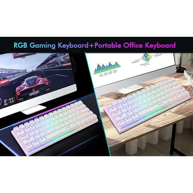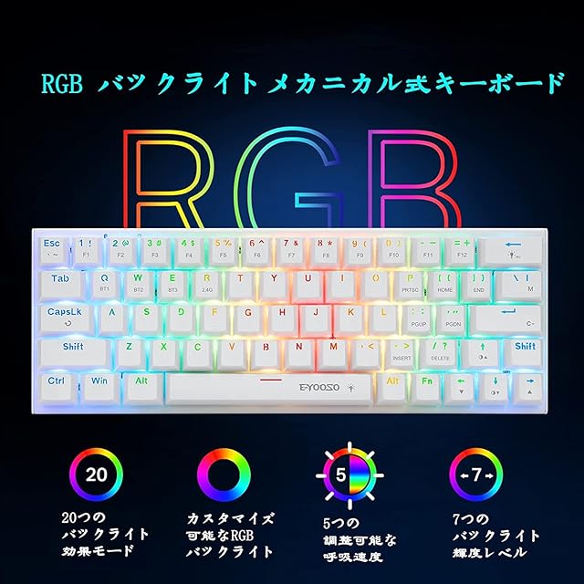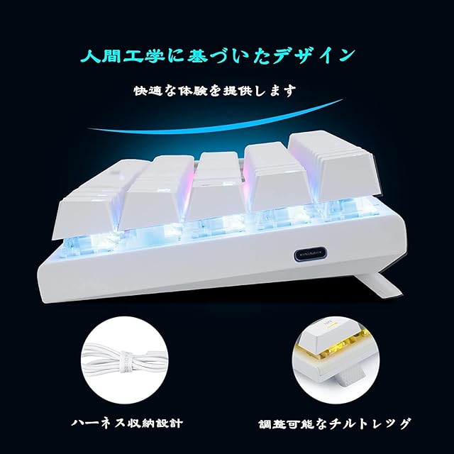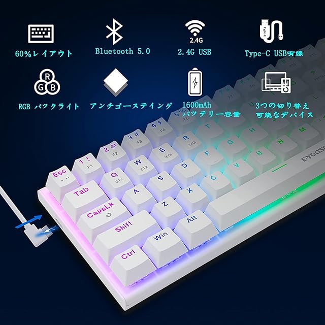 e元素ゲーミングキーボード63キー 茶軸を採用のメカニカルキーボード Bluetoothと2.4Gワイヤレス無線とUSB有線の3つモード接続 充電式 RGB発光LEDバックライト 60%小型コンパクト設計 Windows/Macに対応のゲーム/オフィス用キーボード (ホワイト・茶軸)