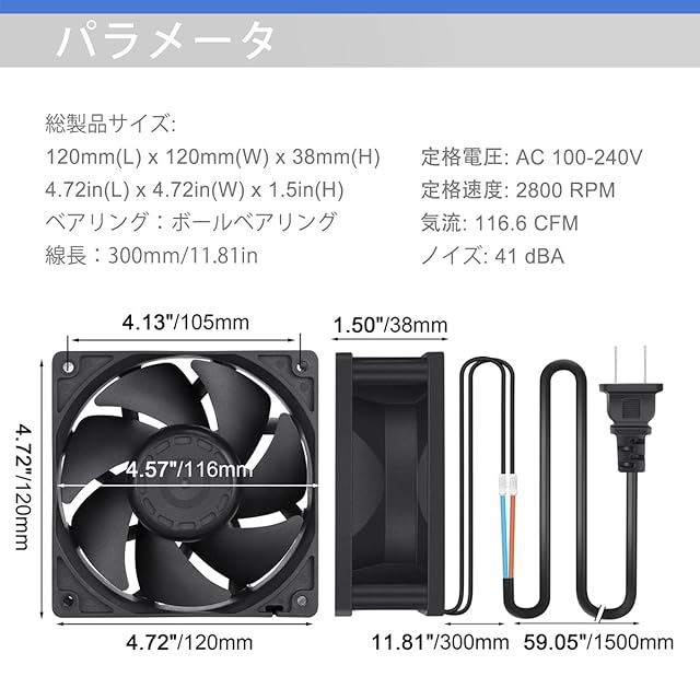 ❀パラメータ: 電圧: 100-240V AC | 速度: 2800RPM | エアフロー: 116.6CFM | 電力: 6W | ノイズ: 41dBA |