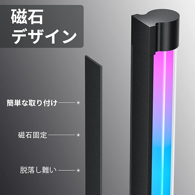 【強力な磁石・自由にに配置】■PCケースのライトバーは、新しい棒磁石吸着型設計を採用しています。 ■背面には強力な棒磁石形状があり、どこにでも好きなように置いてあり、ケース内にしっかりと固定できます。 ユーザーが取り付けるには大変便利です。■ケース内の適切な位置に置くだけで、インストールするツールなしでPCケースに自動的かつ安定して付着します。取り付けた後の状態も安定します。■ミニタワー型PCケース、ミドルタワーPCケース、フルタワーPCケースなど、様々なタイプのケースに適しています。RGBカラーライトは多彩なゲームの雰囲気を作り出し、ゲームの興奮度を高めることができます。プレミアムなデザインと美学。独自のPCケースライトショーを作成します。