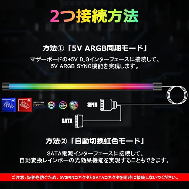 【マザーボード制御 5V 3PIN ARGB/Auto RGB】5V 3ピン ARGB LEDストリップヘッダー付きマザーボード用設計、ASUS AURA SYNC (ARGB) / MSI Mystic Light Sync (J-Rainbow) / ASROCK アドレス可能なRGB / GIGABYTE RGB Fusion / Fusion 2.0、3ピンARGBヘッダー付きマザーボード (+5V、DATA、N/A、GND)に対応。或いは、付属のSATA電源コネクタを使用して、自動変更レインボーLED効果を簡単に得ることができ。
