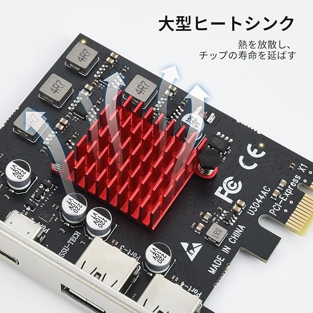 【放熱性】PCIEインターフェースカードは熱伝導率の高い合金素材を採用し、アルミニウム合金製の冷却フィンが付属しているため、効率よく放熱し、常に常温を維持し、耐用年数を延ばします。また、各インターフェイスの電源を安定させるため、コンデンサは250°の高温に耐えるソリッドステートチップタイプを採用しています。