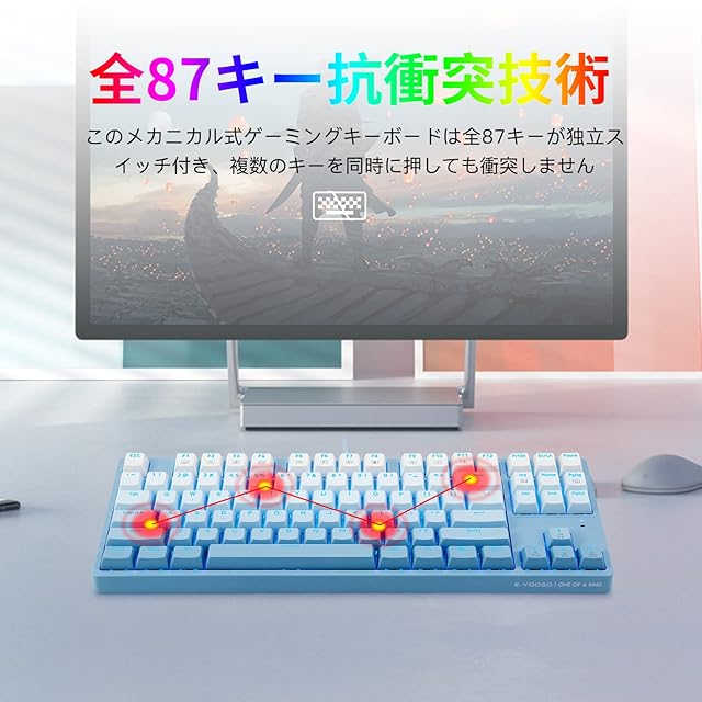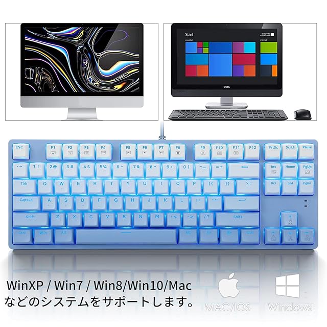 e元素ゲーミングキーボード メカニカルキーボード 青軸 コンパクト87キー防衝突 グラデーションブルーキーキャップ ゲーム用キーボード LEDバックライト USB有線 防水 打ちやすい 英語配列 (青軸)