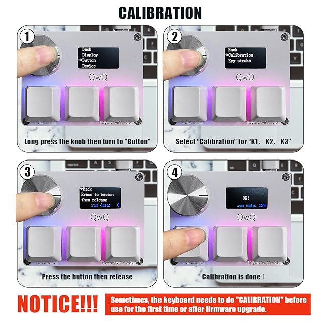 【注意】初めて使用する前やファームウェアのアップグレード後にキーボードで「キャリブレーション」(手順は図を参照)が必要になる場合があります。