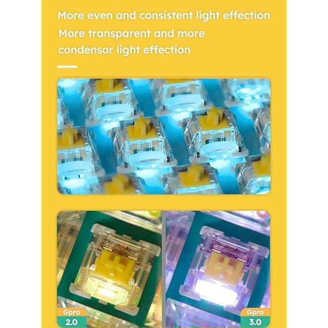 [性能] Gateron G White Pro 3.0 38gf リニアキーボードスイッチ – ベビーアライグーンキーボードスイッチとは異なり、G White Pro 3.0キースイッチリニアスイッチは、ユニークでスムーズなフィードバックを生み出すことを目的とした38gfの操作力で製造されています。 ゲートロンつや消しライトガイド表面を備えた上部ハウジングは、コンデンサーの光効果構造を維持しながら、ライトガイドポールの表面をテクスチャ仕上げにアップグレードし、LED効果をより均一で一貫させます。